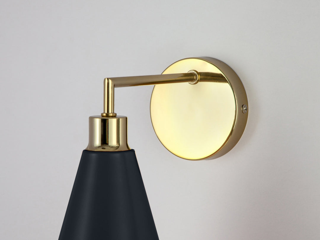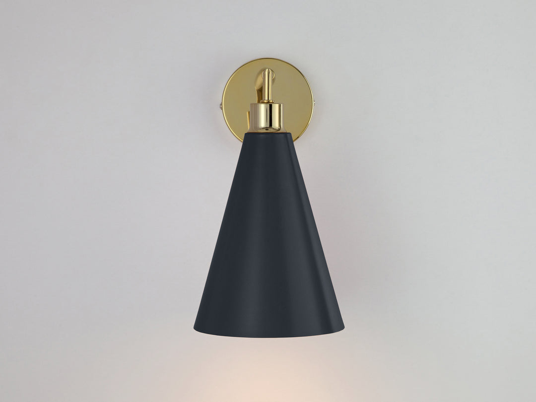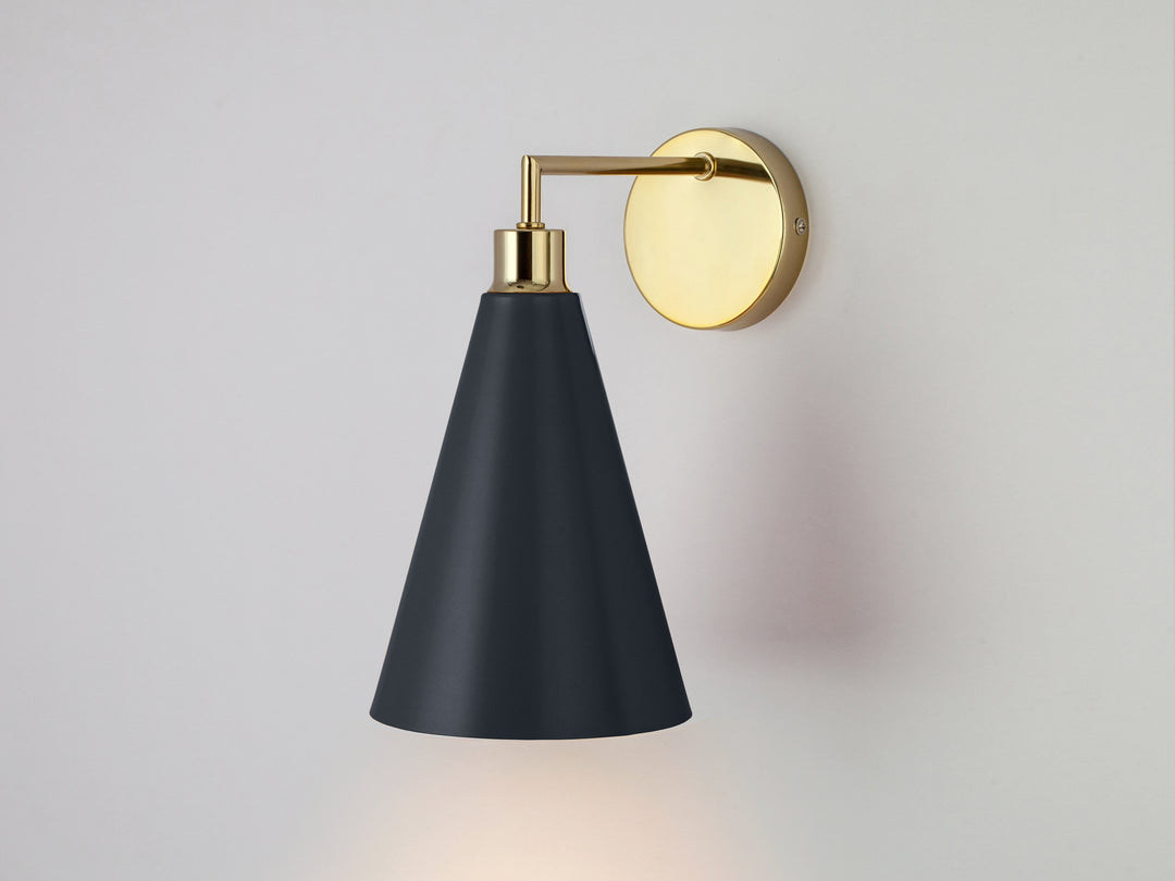 A brass wall fixture suspends a charcoal cone-shaped metal shade.