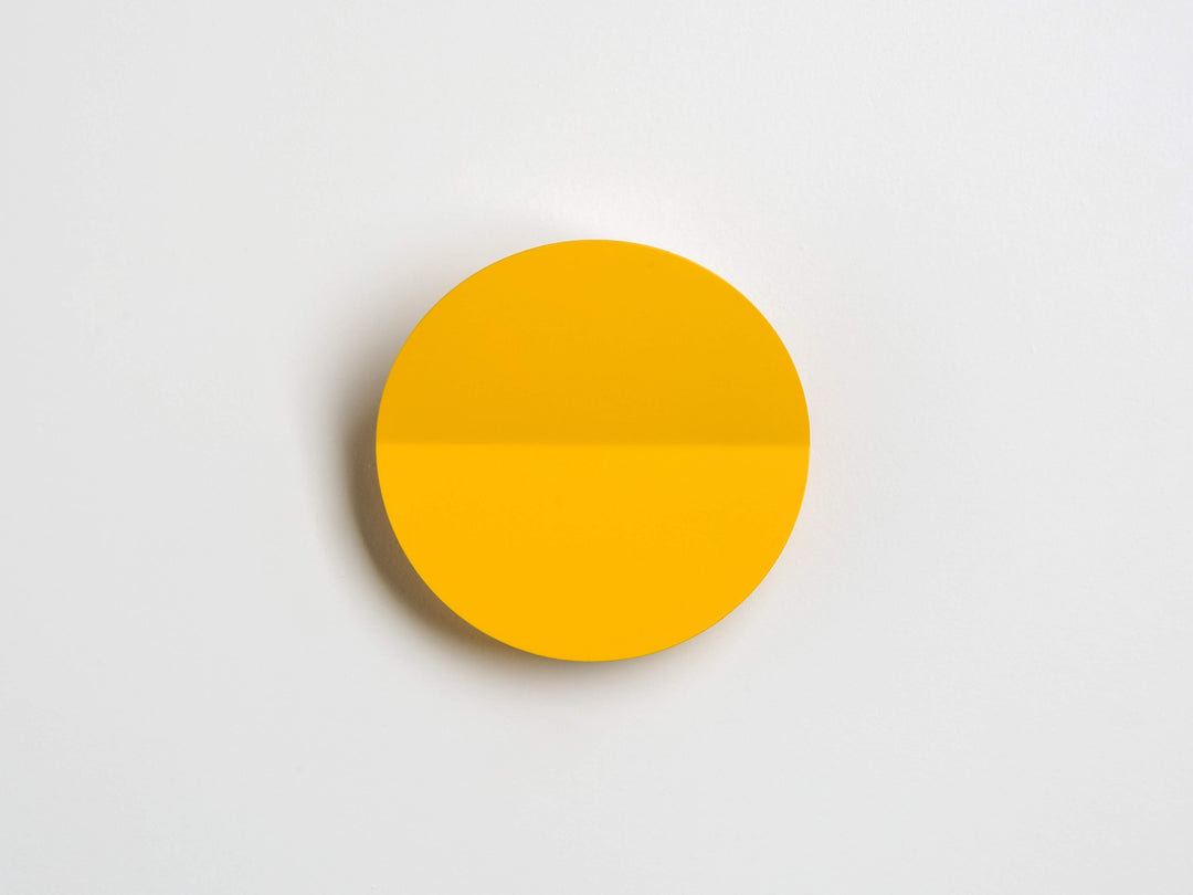 A yellow circular wall light that sits flush to the wall, with a subtle fold and integrated LED bulbs.