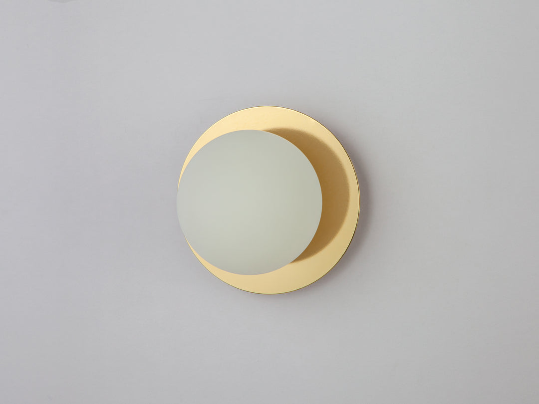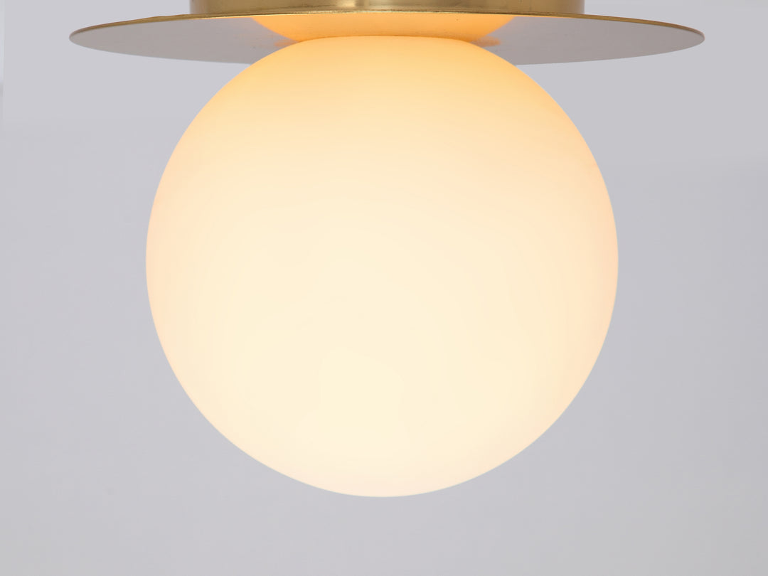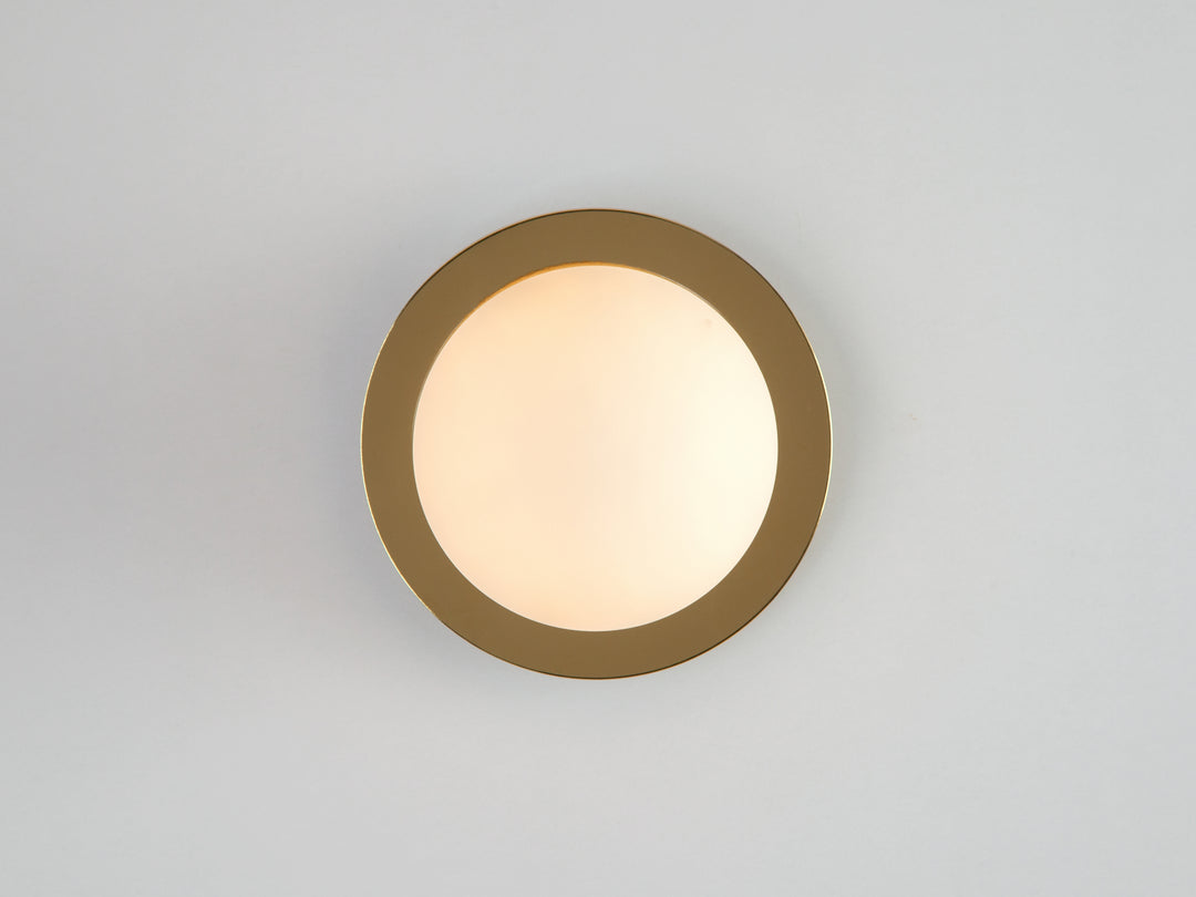 Brighten your home with our bestselling brass opal disk wall light, a versatile fixture that shines bright in any living space. The disk mounted opal glass shade diffuses a warm, illuminating glow wherever you need most, in your kitchens, bedrooms and dining rooms. This fixture is also bathroom suitable, resistant to low velocity water, so style it in multiples around your bathroom mirror for ultimate impact.